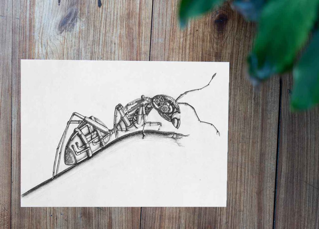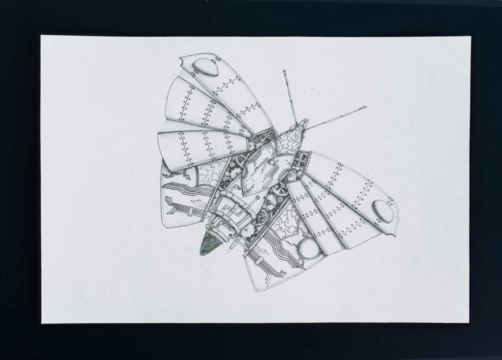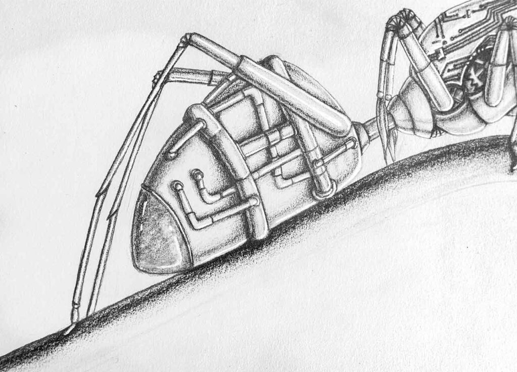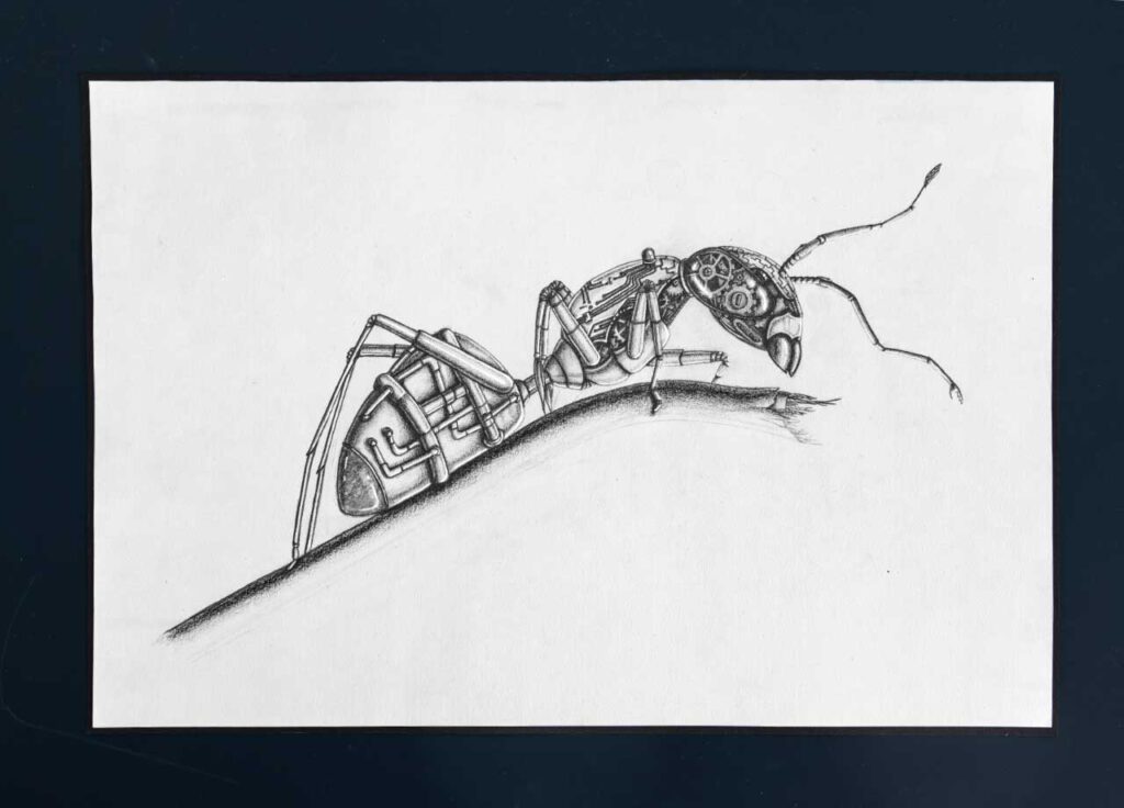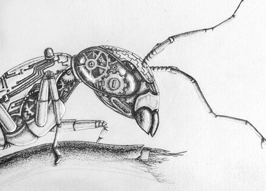 Bleistiftzeichnung zweier mechanischen Insekten.