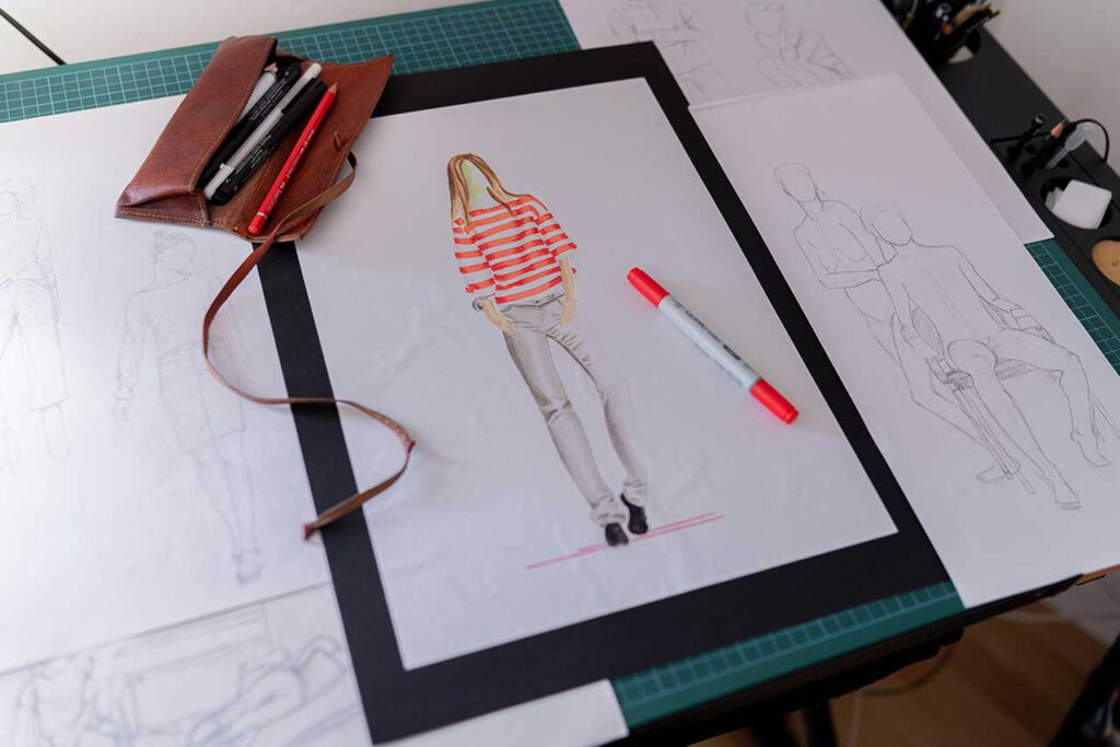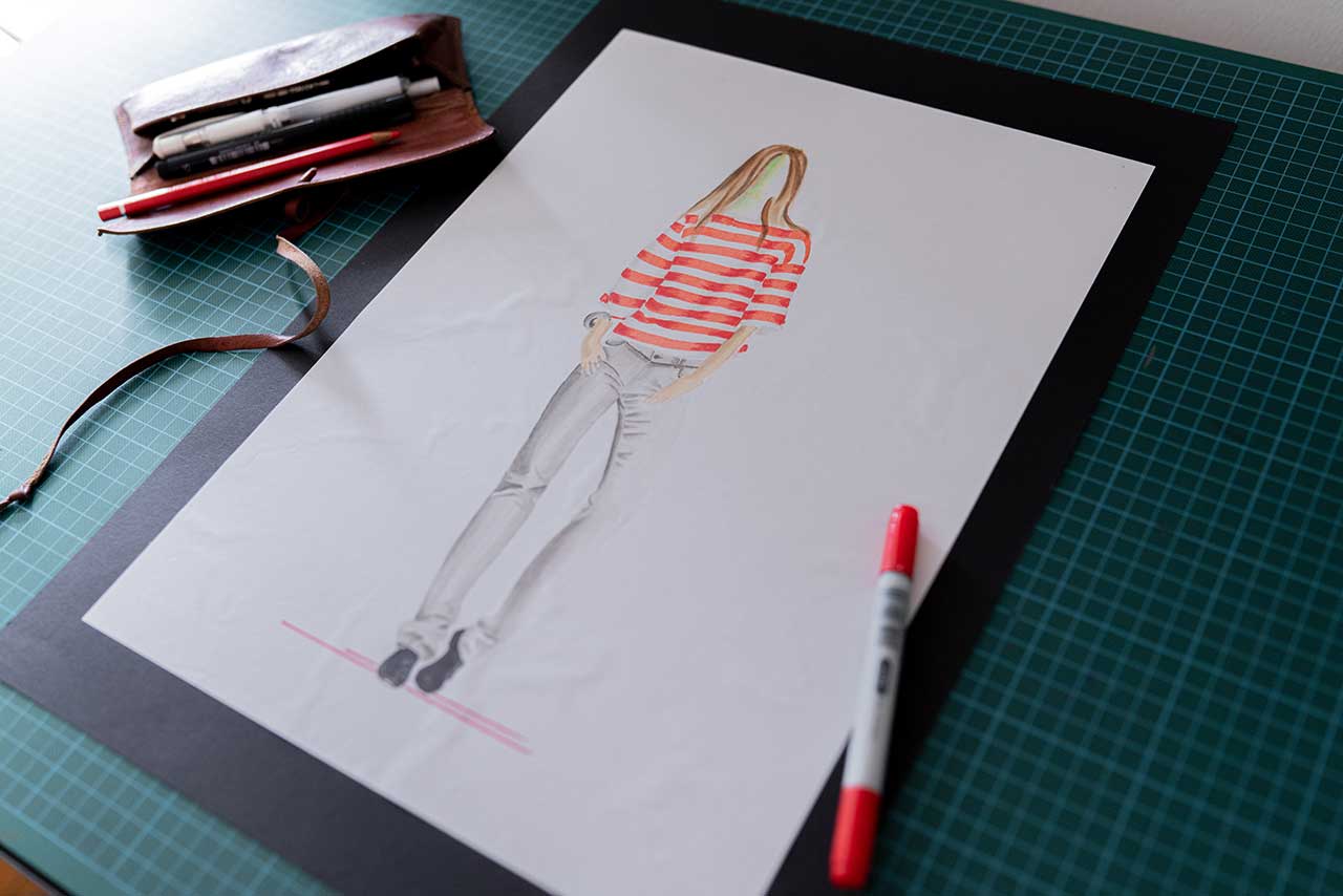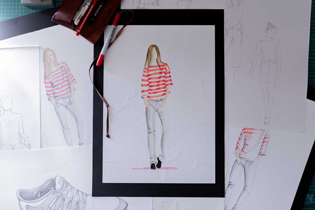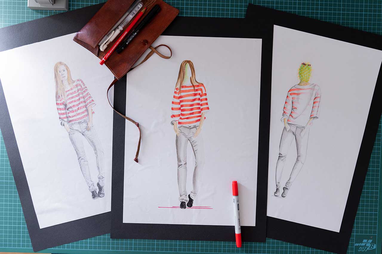 Modezeichnungen und Figurstudien mit Bleistift und Copics gezeichnet.